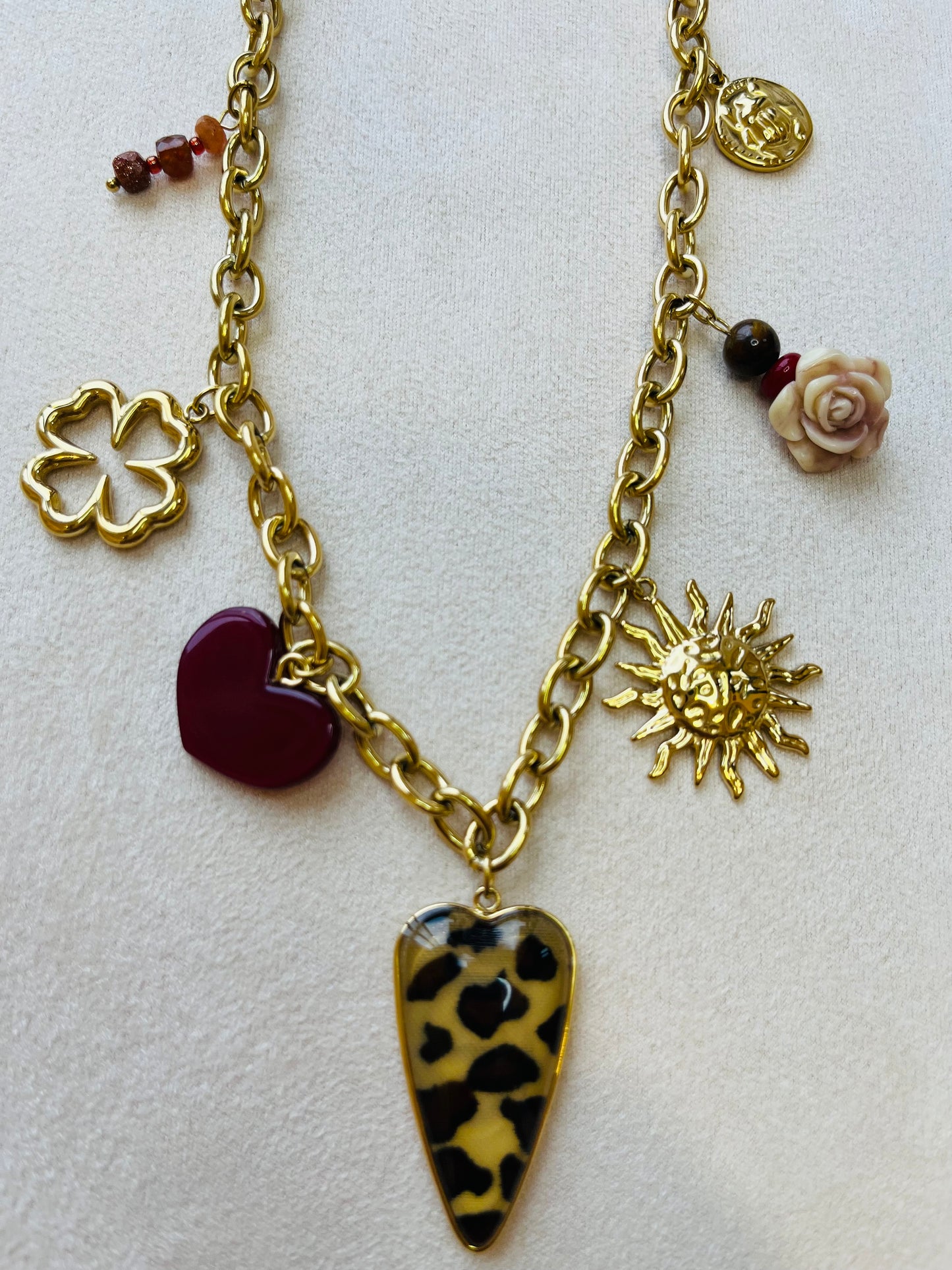Un collier lumineux et riche en symboles, composé d’une chaîne en acier inoxydable doré et de pendentifs soigneusement sélectionnés : scarabée porte-bonheur, trèfle ajouré, cœur rouge, cœur léopard en résine, rose sculptée, soleil rayonnant et petites perles.